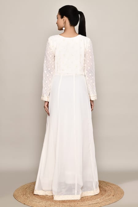 White georgette anarkali featuring embroidery, stone & sequins embellishments. Accompanied by a chinnon silk dupatta.