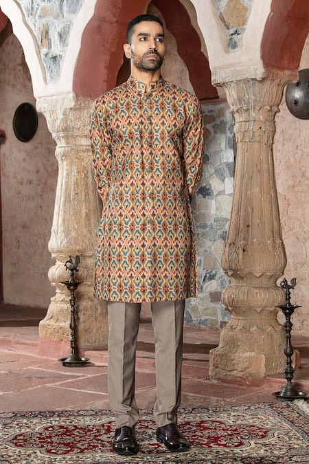 Brown kurta featuring an all-over mandala print and floral metal buttons on the placket. Paired with matching pants for a complete look.