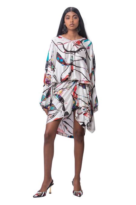 Shop_AK-OK_Multi Color 100% Pure Silk Abstract Print V Neck Top And Draped Skirt Set_at_Aza_Fashions