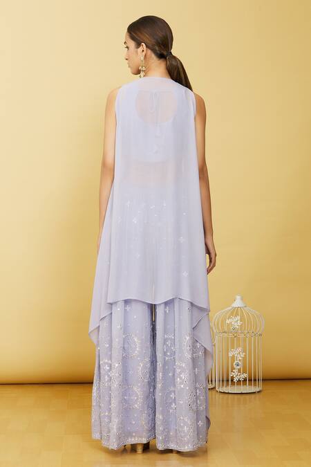 Lilac cropped top with mirror and zardosi embroidery. Paired with a longline embroidered jacket and pant.