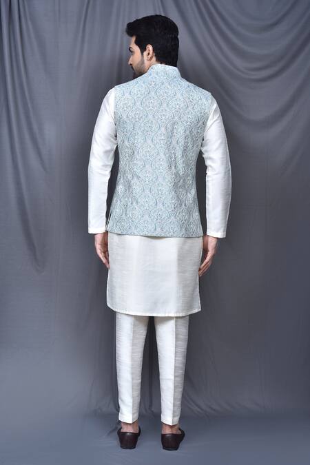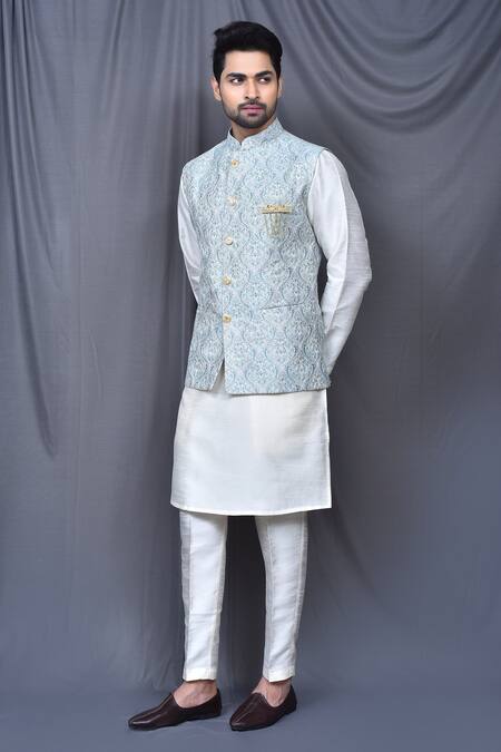 Sky blue bundi with floral thread embroidery & slit pockets. Paired with cream kurta & pant.