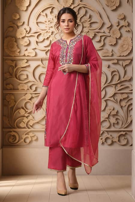 Onion pink straight kurta featuring thread embroidered floral motifs on the yoke and side hem. Paired with a coordinating lace embroidered solid pant and organza border embroidered dupatta.