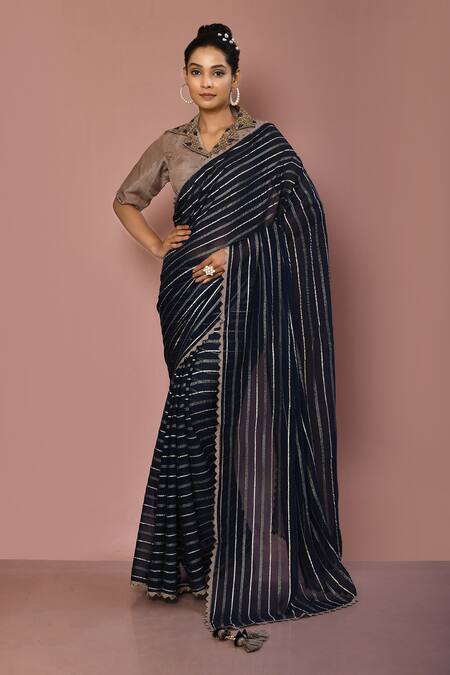Black saree with stripe prints. Paired with embroidered blouse.