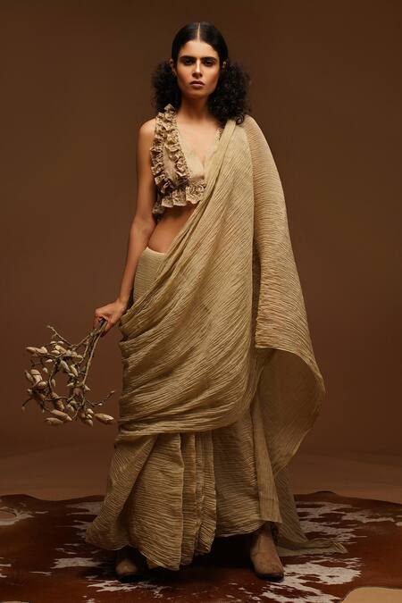 Beige saree with all-over crinkled pattern silhouette. Comes with embroidered ruffle blouse.