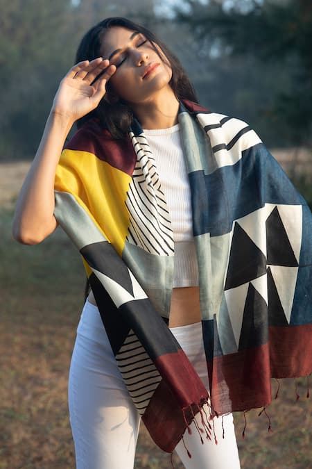 White silk scarf featuring multi-colored geometric hand block prints and frayed edges