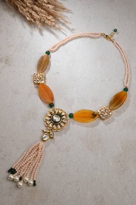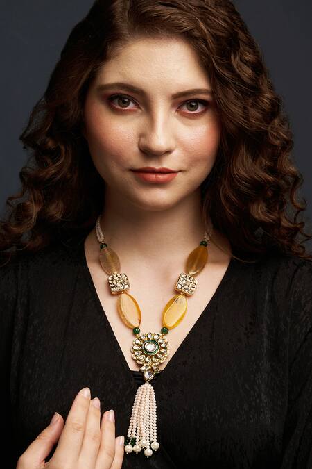Gold finish necklace handcrafted with floral pattern pendant, placement geometric cut work pattern motifs, yellow carved agate stones, kundan, hydro polki, pearl embellishment, agate & pearl beaded tassels.