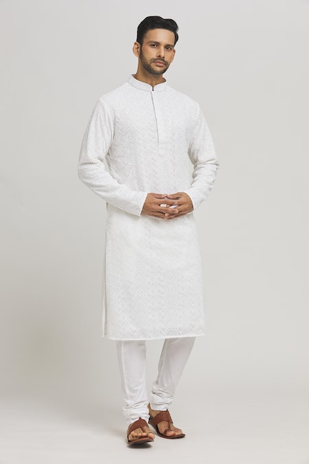 White kurta featuring sequins and thread embroidery with a mandarin collar. Paired with a churidar for a complete look.