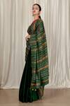 Green block printed silk saree featuring modern stripe motifs in earthy shades. Paired with a contrasting red halter blouse.