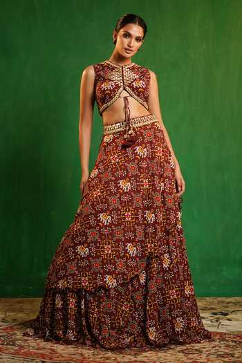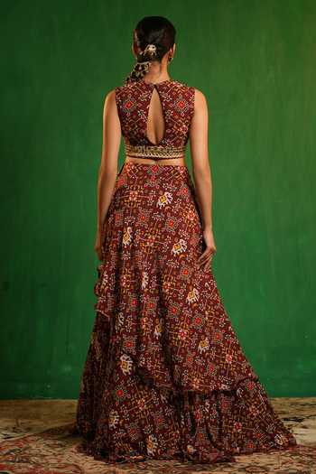 Maroon Georgette High Neck Patola Print Lehenga And Blouse Set