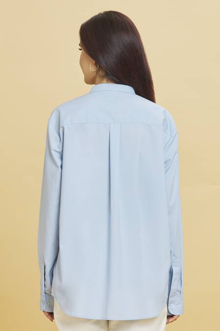 Sky blue shirt featuring full sleeves and a mandarin collar with crocodile doodle embroidery