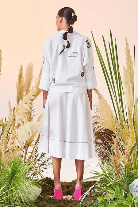 Spread collar, Embroidered post cards, stamps and typography, Note:Skirt worn by the model is not for sale