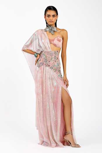 Pink Velvet, Tulle Sweetheart Astrale Sequin Work Pre-draped Saree With Bralette