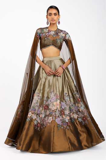 Copper metallic appliqué embellished tissue lehenga with a tulle cape blouse.