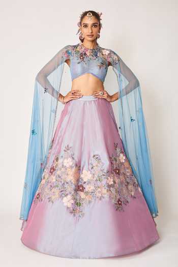 Wisteria blue applique embellished tissue lehenga with a tulle cape blouse.
