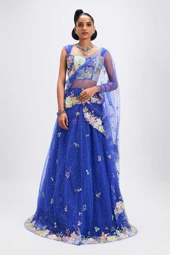 Persian blue applique embellished net-stitched saree lehenga. Includes a ruched strap blouse.
