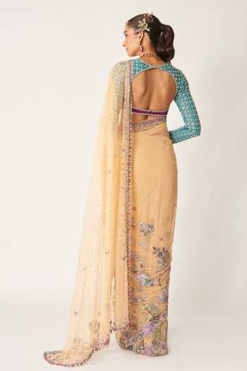 Bisque applique-embellished tulle saree with intricate floral motifs. Paired with a mulberry crepe sweetheart full-sleeve blouse.