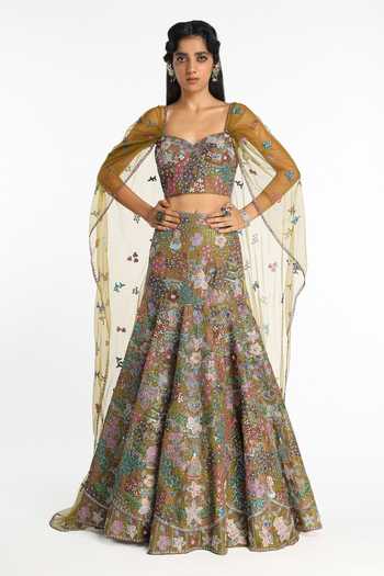 Olive applique-embellished organza lehenga and blouse with a tulle sleeve cape.
