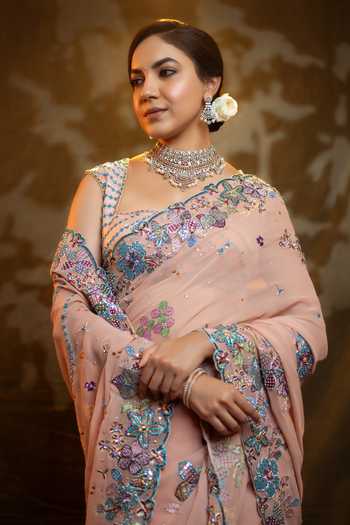 Peach Georgette Square Neck Edelise Saree With Blouse