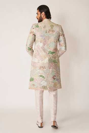 Ivory applique embellished raw silk sherwani. Paired with a lurex kurta and matching pant.