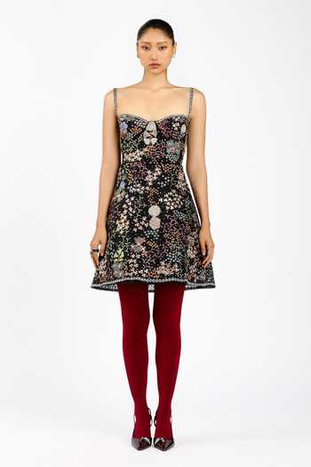 Black applique-embellished tulle babydoll dress.