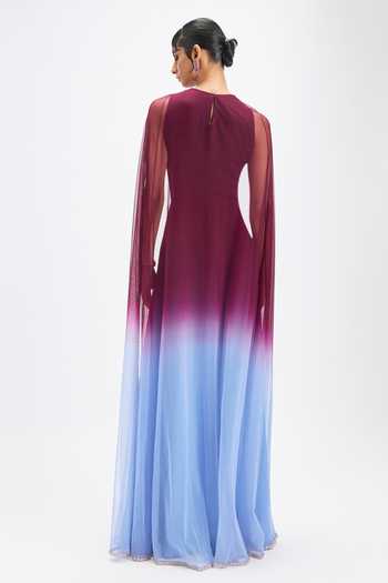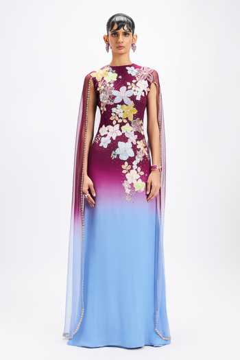 Plum-blue applique embellished georgette gown. Features cape detailing.