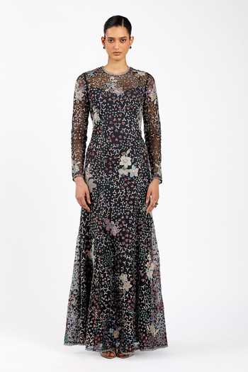 Black Tulle Embroidery, Applique Round Neck Noirine Gown