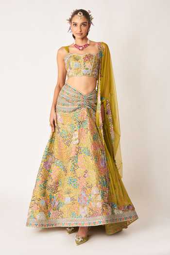 Olive applique-embellished tissue lehenga with a ruched waist, paired with a corset blouse and tulle dupatta.