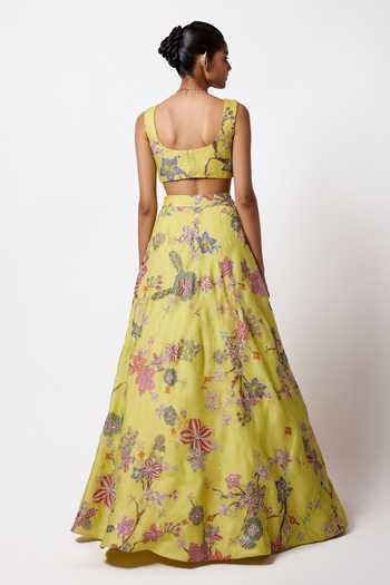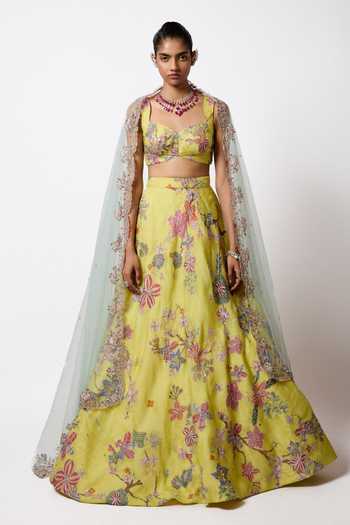 Matilda lime printed embellished organza bias lehenga with blouse and tulle dupatta. The set includes a printed lehenga, matching blouse and a tulle dupatta.