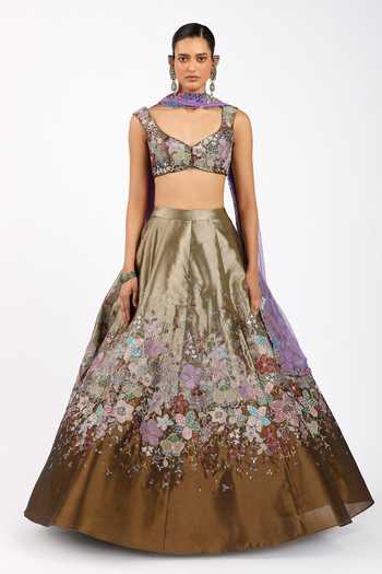 Brown Tissue, Tulle Sweetheart Neck Tenebra Copper Metallic Lehenga Set