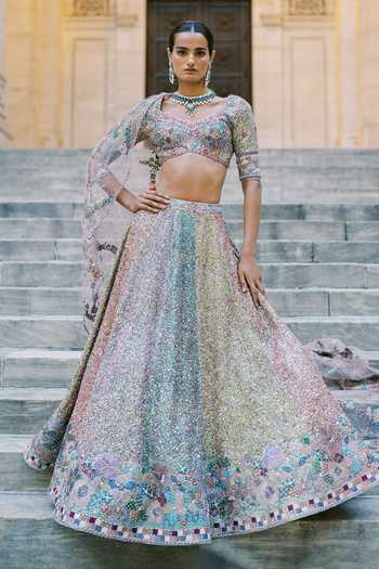 Multicolour printed lehenga set in sequin tulle with applique embellishment and a tulle net dupatta.