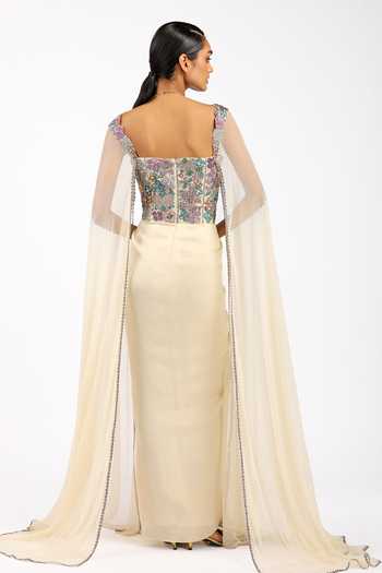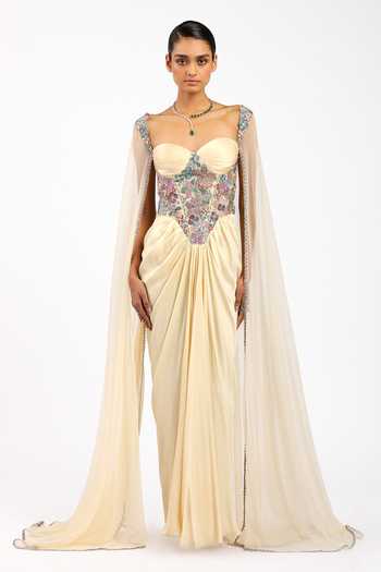 Beige gown with an applique-embellished corset bodice in silky satin and a ruched, pleated skirt. Finished with an attached tulle cape.