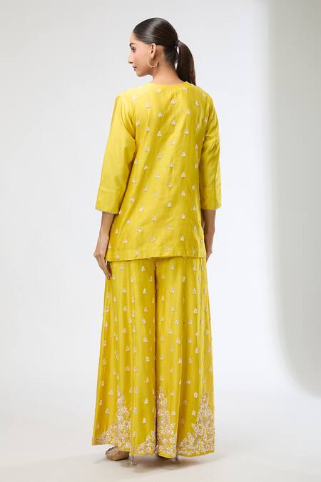 Buy_Aksh_Yellow Chanderi, Organza Embroidery Round Neck Hand Kurta Set