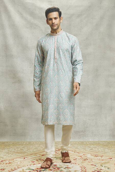 Sky blue kurta featuring long sleeves and a mandarin collar with Mughal garden embroidery. Paired with a plain churidar and designed with side slits and front placket buttons.