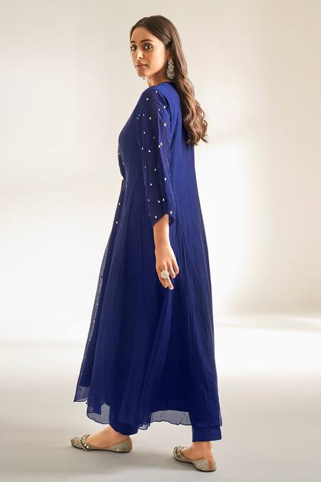 Persian blue soft chanderi anarkali with silver coins, sequins and aari embroidery. Comes with pant.