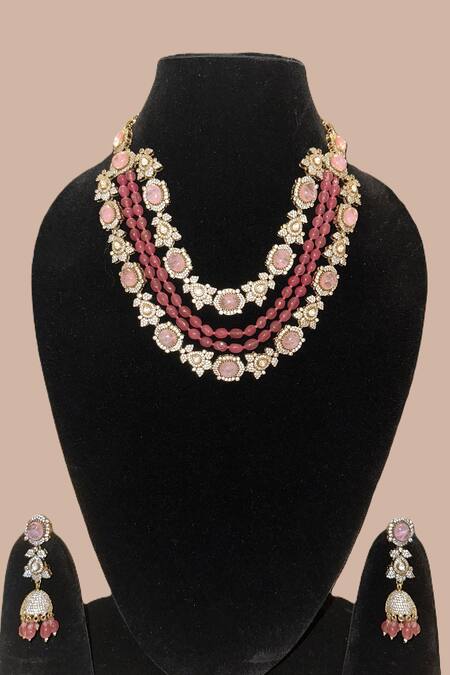 Multi color multi-strap necklace featuring pink and ruby red stones with geometric ornamentation. Paired with matching earrings adorned with tear drop details.