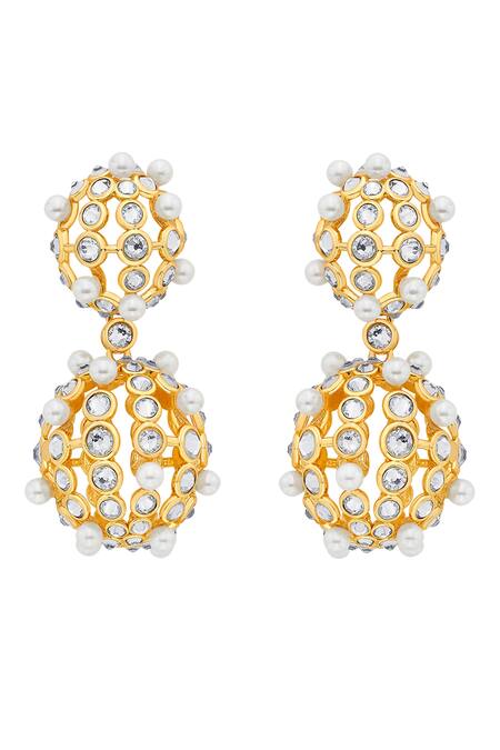 18kt gold plated double lattice earrings with white cubic zirconia crystals & shell pearl embellishment.
