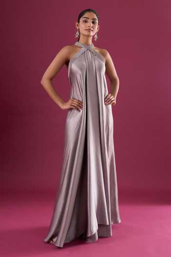 Grey Satin, Chiffon Beads Halter Neck Placed Embroidered Dress