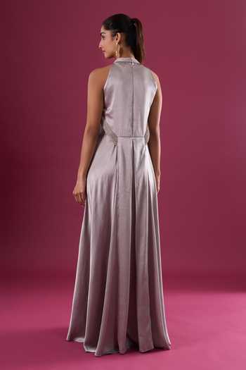 Silver maxi dress with halter neckline, embellished choker collar and flowing pleated drape. The satin chiffon silhouette falls to a floor-length shape suitable for evening wear.