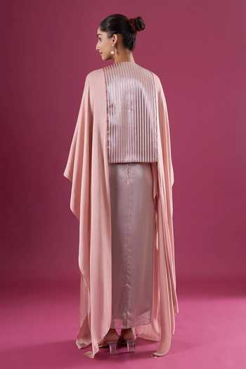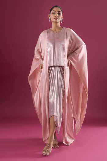 Pink skirt set features a chiffon cape and a sequin-adorned cropped top. A flowing skirt completes the set.