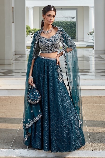 Deep teal swirl textured lehenga featuring shimmer threads and a length of 44 inches. Paired with a padded blouse adorned with floral and mirror embroidery, along with a dupatta featuring a floral embroidered border.