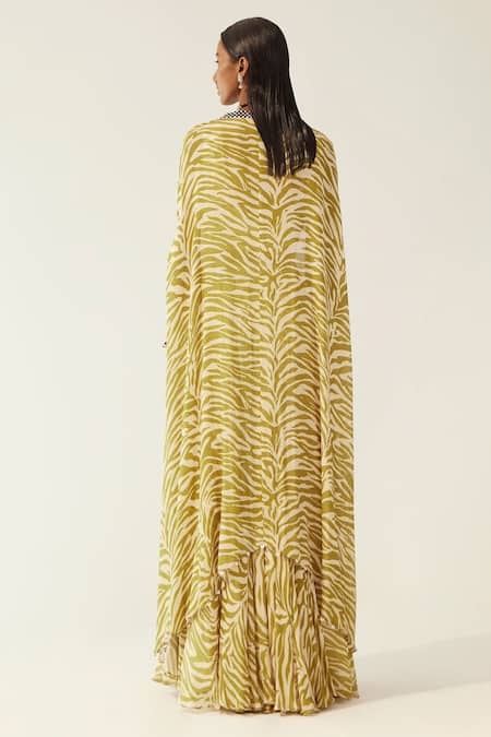Green Chiffon Embroidery Square Neck Nicobar Leopard Print Cape Lehenga Set
