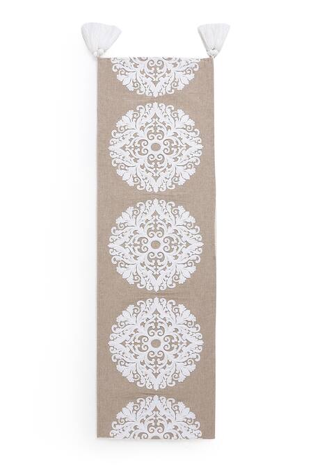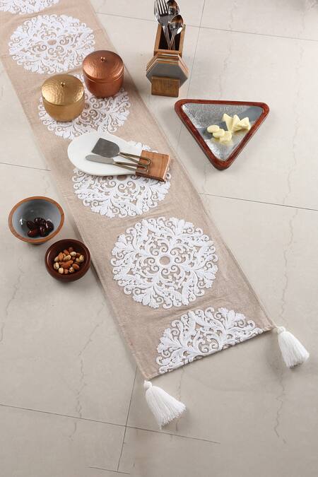 Beige table runner white floral embroidery & tassel border.