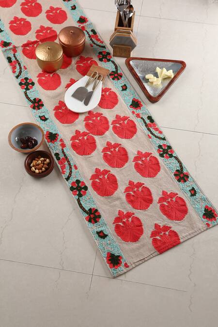 Ivory rectangle shaped table runner with red & multicolor floral embroidery.
