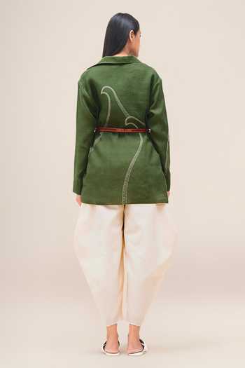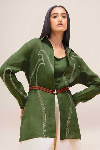 Fern green linen shirt with ivory bird motifs and intricate filigree-inspired borders. Comes with a fern green inner top and a tan faux-leather belt with a silver buckle.