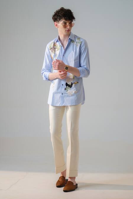 Blue shirt featuring full sleeves, collar neckline, and magpie embroidery with stripes detailing