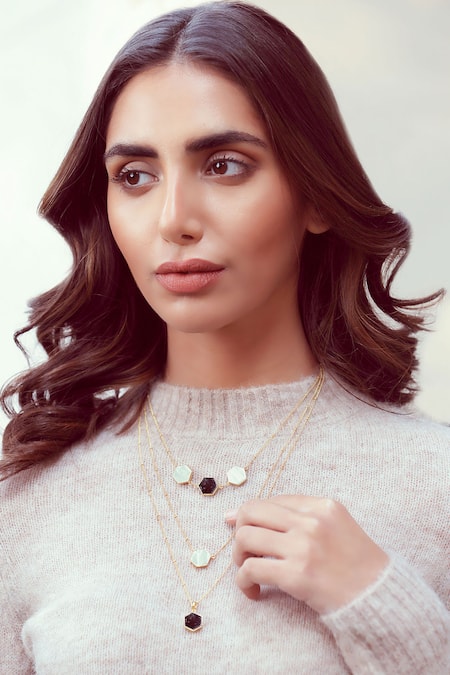 Layered necklace featuring black onyx and white mother of pearl hexagon pendants