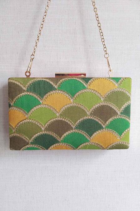 Green rectangular clutch featuring a shaded scallop pattern with thread detailing