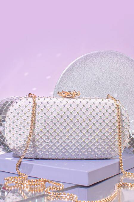 Off White clutch featuring a capsule structured shape, layered mesh fabric, and all-over holographic stone embellishment
