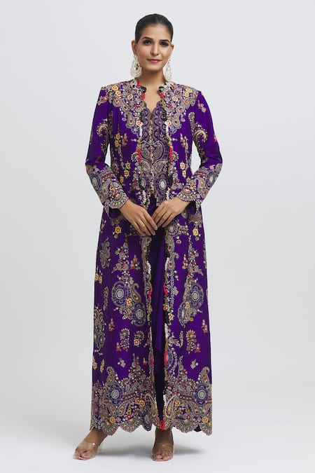 Buy_Anamika Khanna_Purple Silk Beads, Cut Work Open Mughal Pattern Embroidered Jacket Skirt Set