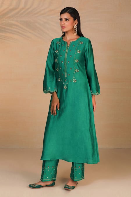 Green kurta with floral embroidered motifs & scallop hem sleeves.